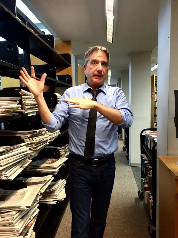 Bill Harmer in the far end of the main floor. Newspapers and stacks will move downstairs, giving way to grandstand seating, an LED screen, the new McManus Room and a recording studio. (Photo/Lynn U. Miller)